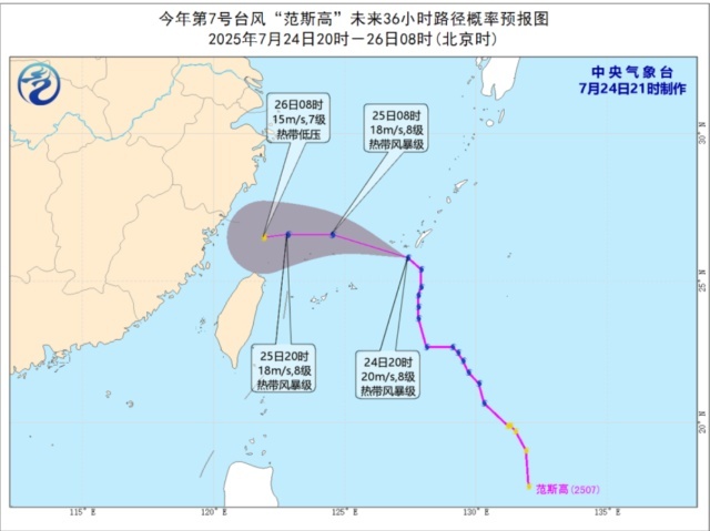 截至7月24日20时,台风“范斯高”位于距离浙闽交界偏东方向约710公里的海上,强度为热带风暴,预计其将以每小时25公里左右的速度向西偏北方向移动,强度变化不大。