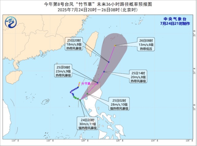 台风“竹节草”位于距离菲律宾马尼拉西北方向约240公里的海上,强度为强热带风暴,预计其将以每小时30公里左右的速度向东北方向快速移动,强度逐渐减弱。