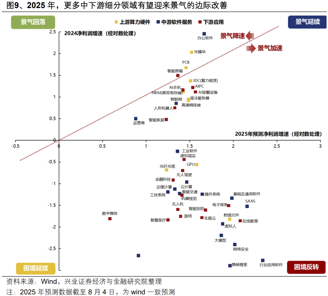 其次,从国内自身景气预期来看,随着AI产业突破、内需复苏,2025年不少中下游细分领域有望迎来景气的边际改善。不少中下游领域在2025年有望进入困境反转或景气加速的阶段,包括景气加速(AI穿戴设备、AIPC、AI手机、人型机器人)、困境反转(行业应用软件、SAAS、在线教育、网络安全、基础及通用软件、电子政务、大模型、操作系统、游戏)。