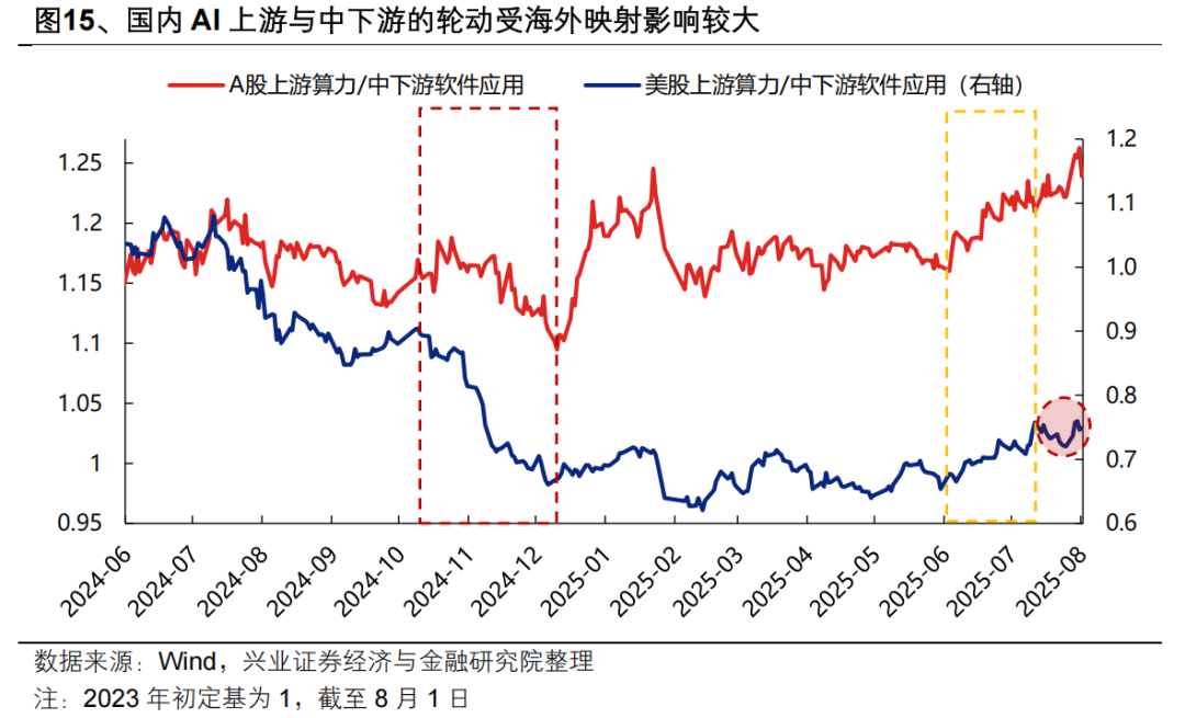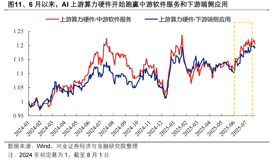 其次,海外映射看,微软、META最新业绩再次印证AI应用商业化加速,近期海外AI中下游软件应用已开始跑赢上游算力,有望对国内形成映射。国内AI上游与中下游的轮动受海外映射影响较大,例如去年四季度,随着AppLovin、Palantir、SoundHound AI等中下游公司的业绩开始兑现,盈利验证下海外AI行情的交易主线开始向中下游切换,由此也带来国内AI行情向中下游的扩散。而今年6月以来的北美算力链行情,除了板块自身景气优势外,海外算力持续跑赢带来的映射也是重要因素。