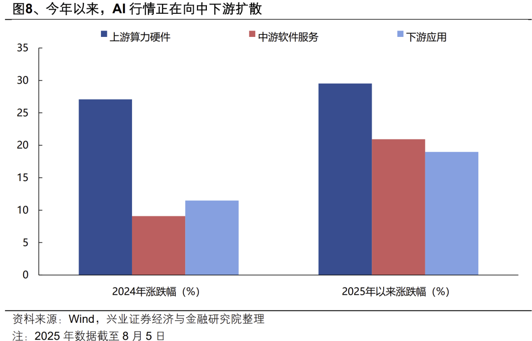 最后,从后续催化的角度看,随着业绩披露期过后,科技板块对即期业绩的关注度减弱、开始定价中长期产业趋势,叠加近期H20芯片限制放开、Kimi和阿里等新模型发布、2025世界人工智能大会、8月GPT5发布等事件边际催化,也为AI行情向国产算力和中下游应用扩散提供更好的契机: