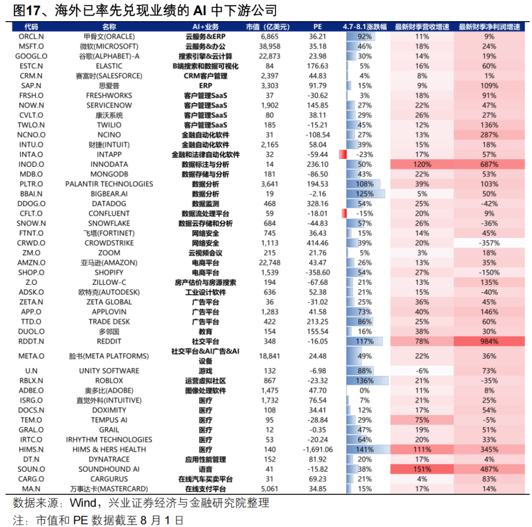 首先,海外AI发展经验是一个很好的借鉴。自去年四季度以来,美股已经跑出了一批以AppLovin、Palantir、Duolingo为代表的成熟AI中下游应用公司,今年以来更多应用公司正在迎来业绩兑现。参考美股,AI+模式有望率先跑通、应用有望率先落地的领域主要集中在云服务、ERP企业管理系统、客户管理SaaS、金融自动化软件、数据分析、电商平台、广告平台等To-B端领域,以及教育、社交平台、游戏、医疗、语音等To-C端领域。从近期股价表现看,市场更加认可、有望形成映射的领域主要集中在To-C端的虚拟社区、社交平台、医疗、游戏,以及To-B的数据分析、广告、ERP企业管理系统、办公软件、客户管理SaaS等领域。