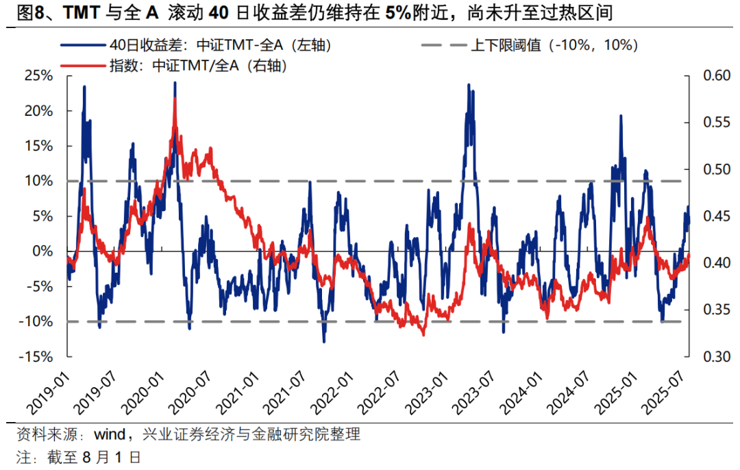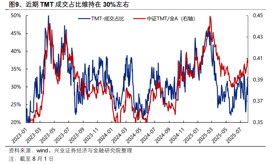 成交占比看,近期周期板块表现更强,当前TMT成交占比已下降至30%以下,距离历史上40%-45%的过热区间仍有距离,尚未发出过热信号。