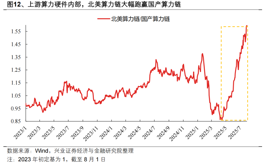不过,板块内部已经出现两个明显的分化。一方面,上游算力硬件开始跑赢中游软件服务&下游端侧应用;另一方面,上游算力硬件内部,以光模块、PCB为代表的北美算力链大幅跑赢芯片等国产算力链。