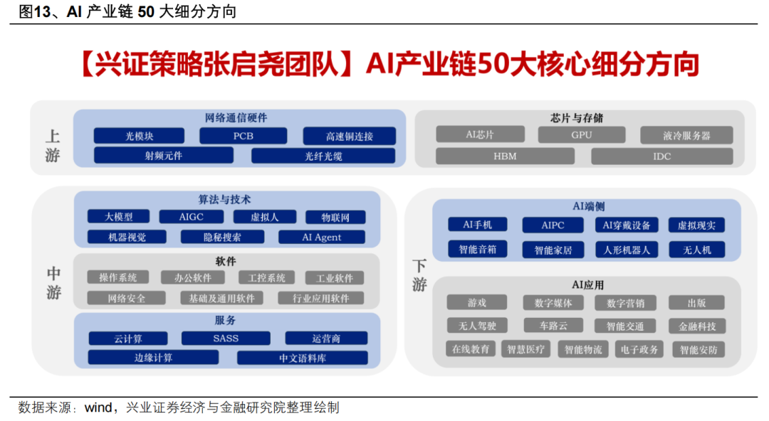 二、AI+怎么+?AI+是一个庞大的产业链条,如何把握配置抓手?AI、TMT是一个市值占比超过20%,涵盖上游算力硬件、中游软件服务以及下游应用的庞大产业链条。其中,中下游涉及的领域更多、覆盖范围更广,做好行业比较的意义更加重要。